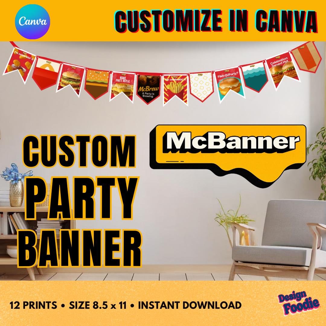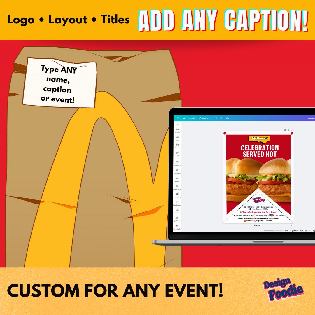 ⨠What Youâll Get Youâll receive immediate access to: â Editable Canva Template (customize name + text) â Editable McDonaldâsâstyle Logo included on Banner (customize name + text) â High-Resolution Export Options: PNG, JPG, and PDF â 8.5Ă11 printer-friendly panels for easy home printing â Step-by-step instructions for editing + printing â Instant download â no waiting, no turnaround time