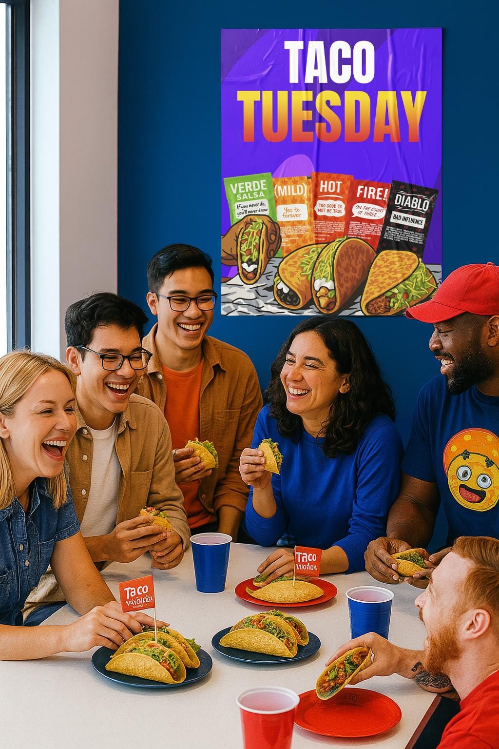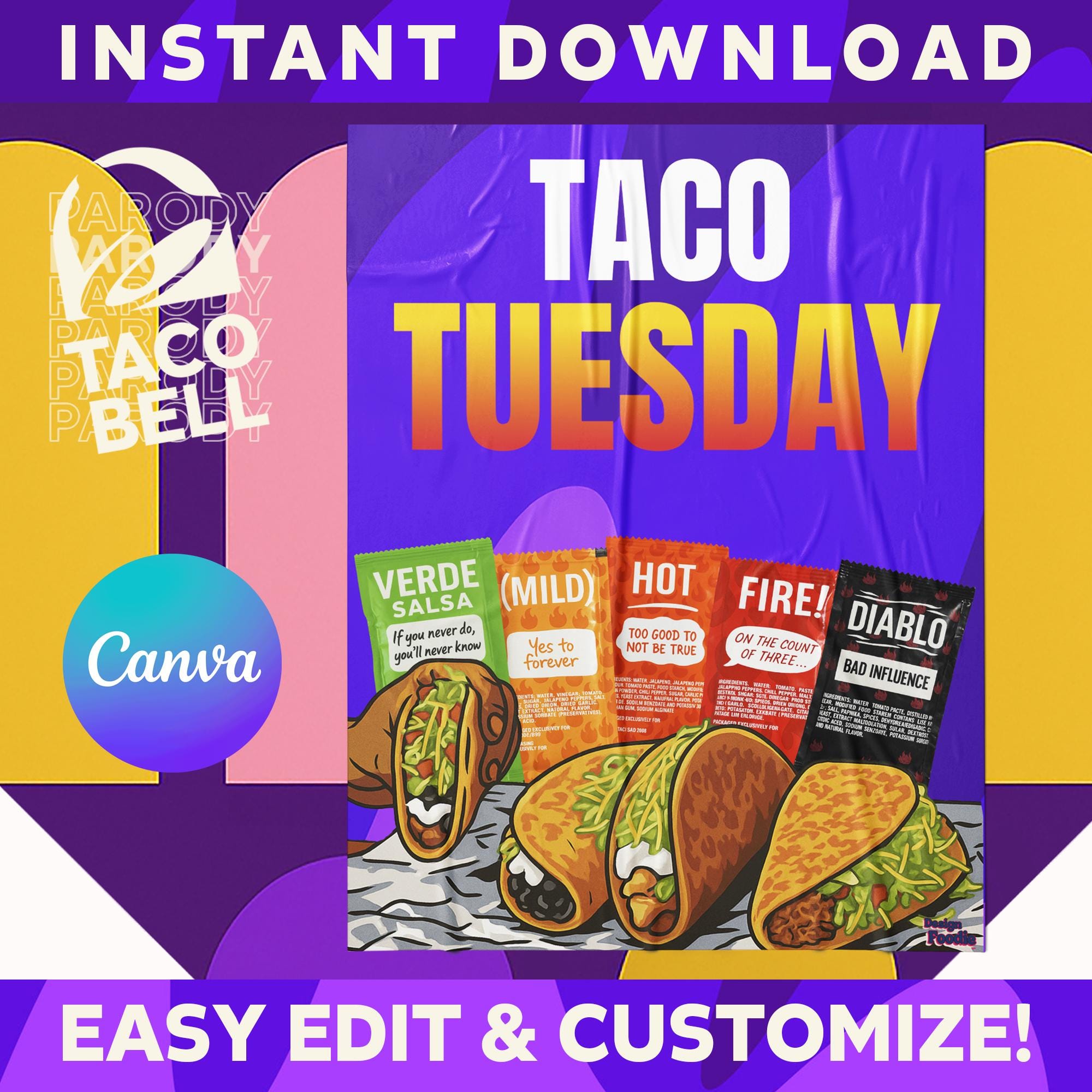 🧡 FEATURES: • Editable in Canva – no design skills needed! • Fun sauce packet artwork (Verde, Mild, Hot, Fire, Diablo) • Bright purple + orange gradient “Taco Tuesday” title • Perfect for corporate offices, HR teams, and event planners • Use for Taco Tuesday, Cinco de Mayo, team lunch events & more!