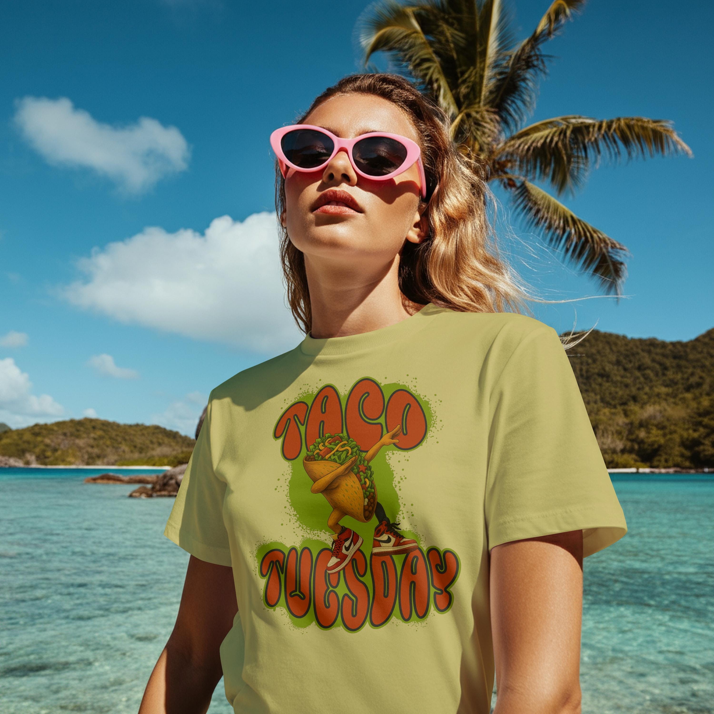 🎨 Design Details: Original hand-drawn taco character Retro “Taco Tuesday” bubble font with vibrant green & orange splash Inspired by streetwear, sneaker culture, and taco vibes
