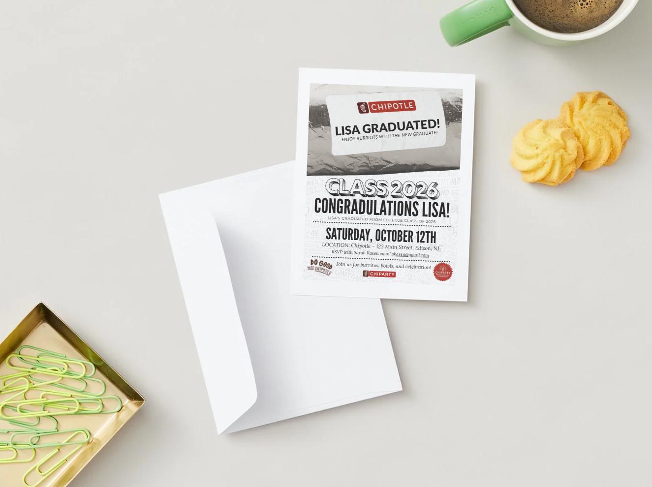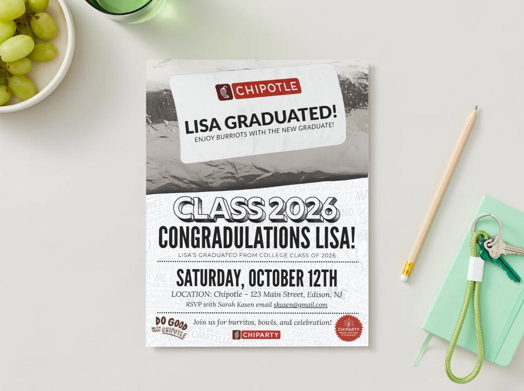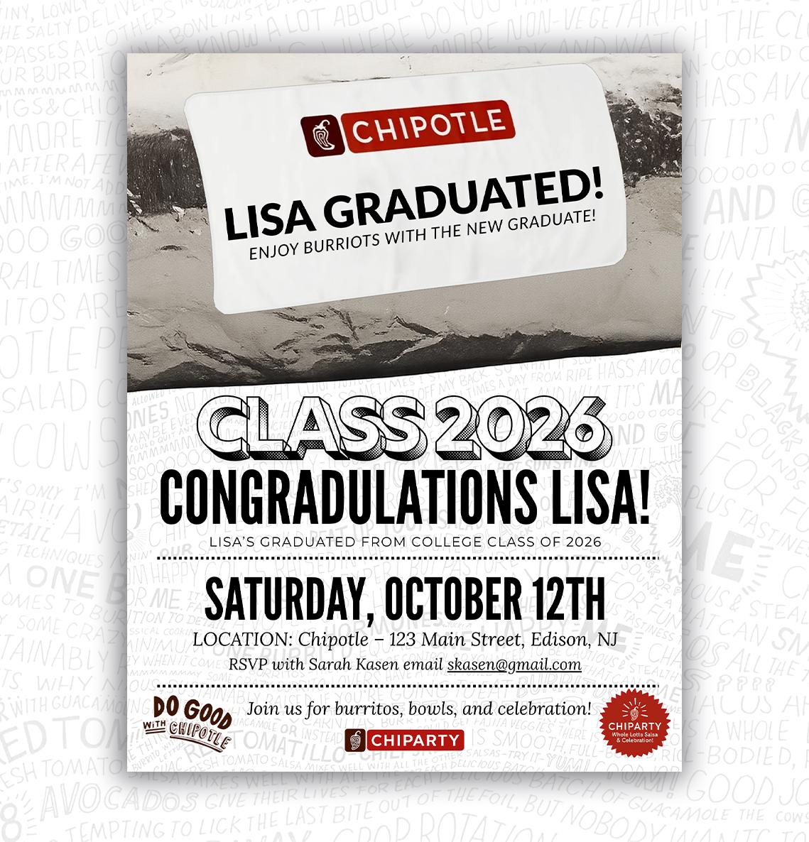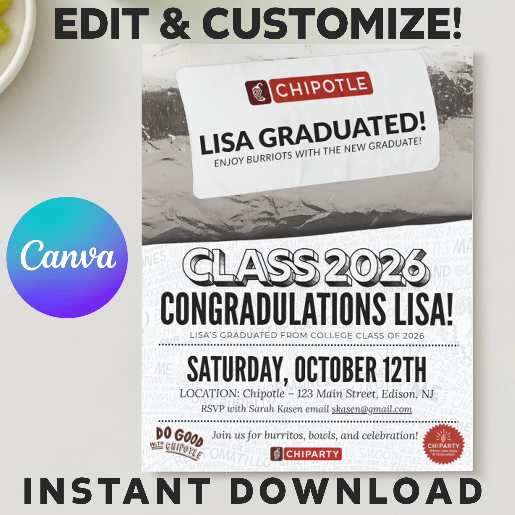 🎉 Throw a Chipotle-style party they’ll never forget with this Chipotle-inspired party flyer! 🌯 This editable Canva template is perfect for announcing a graduation party in a unique and creative way. Personalize the flyer with your graduate’s name, class year, party details, and RSVP info — then print or share digitally.