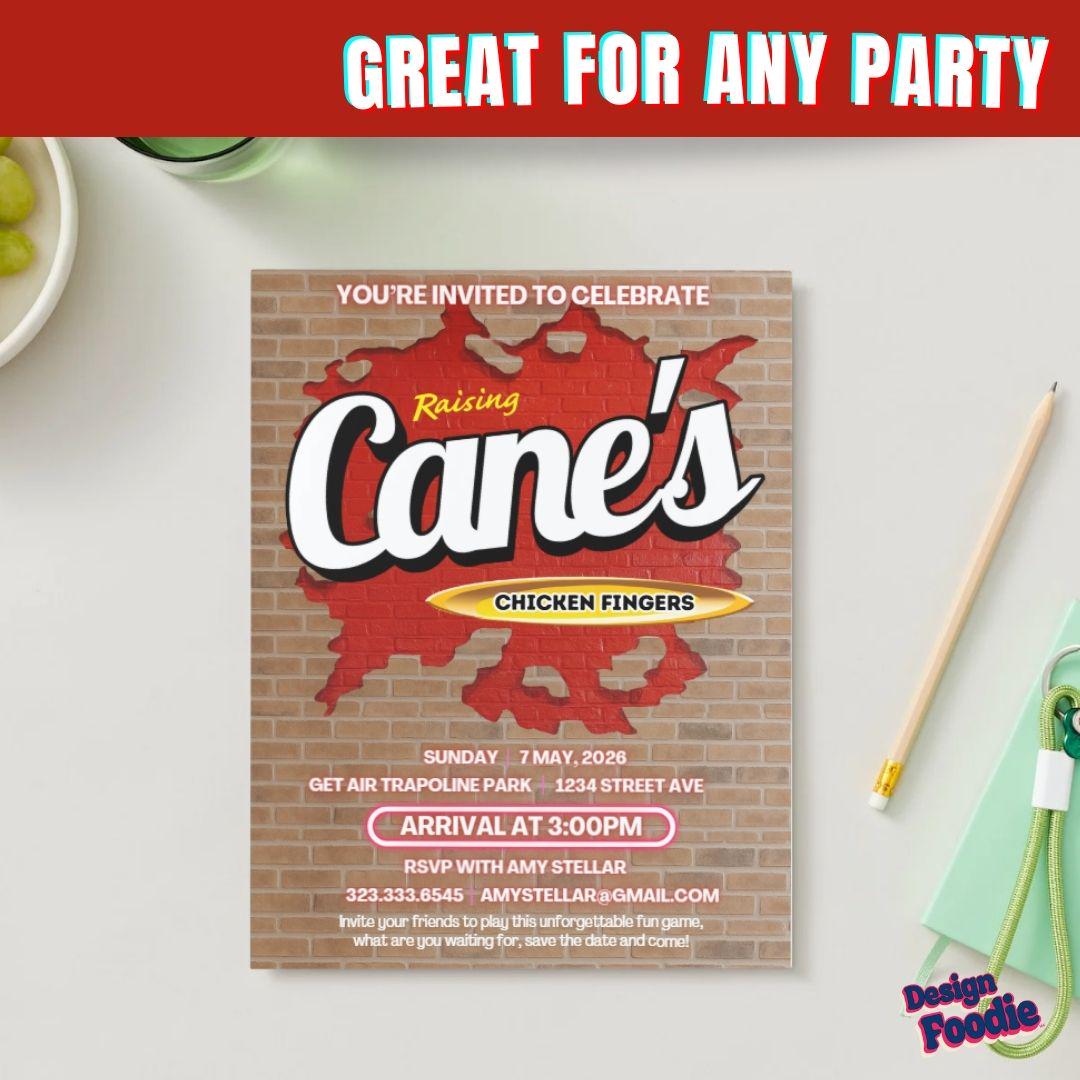 Throw the perfect fast-food-themed celebration with this Editable Raising Cane’s Party Invitation! Edit in minutes using Canva — no software needed. Perfect for birthdays, teen parties, office events, graduations, or anyone who LOVES Raising Cane’s.