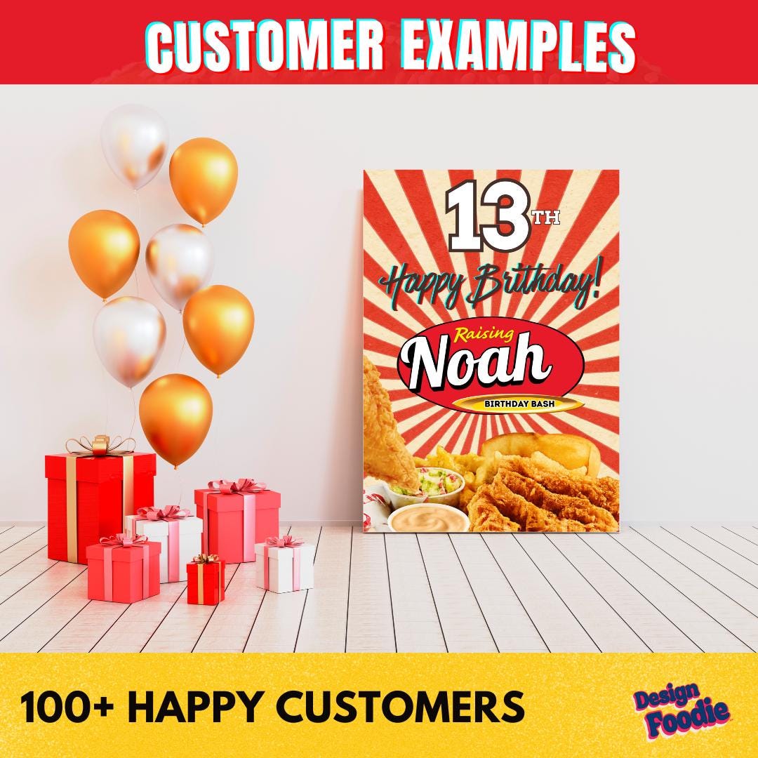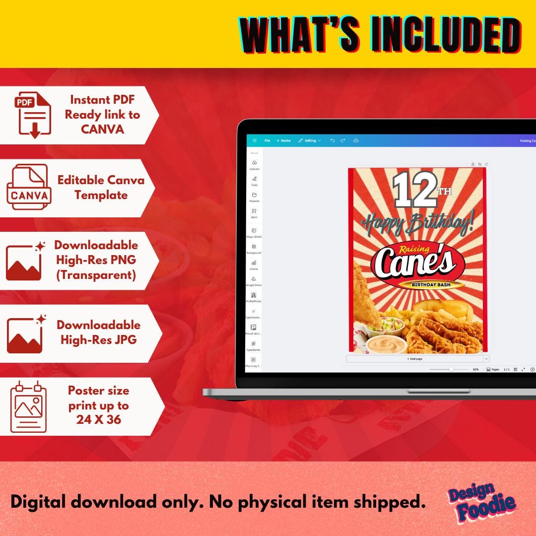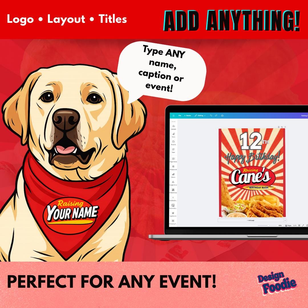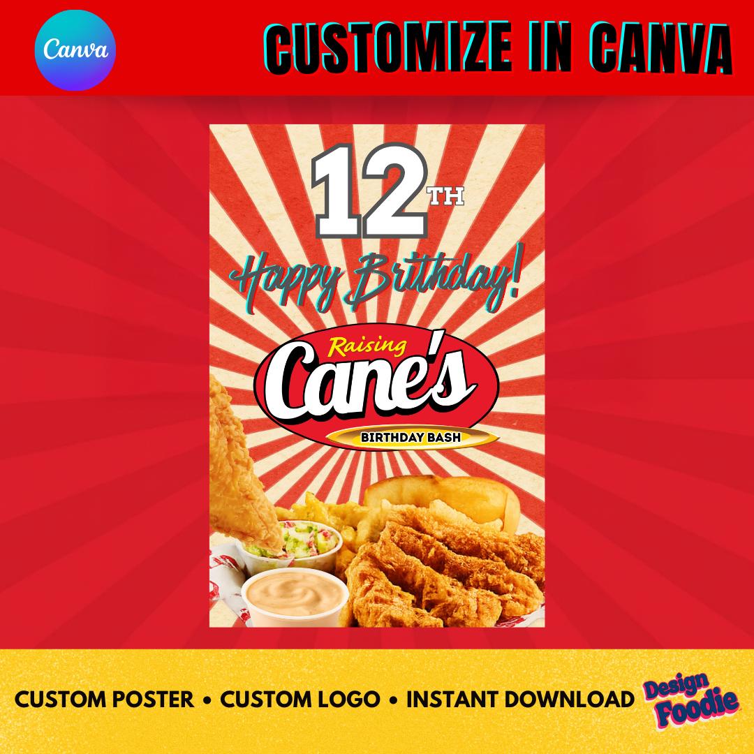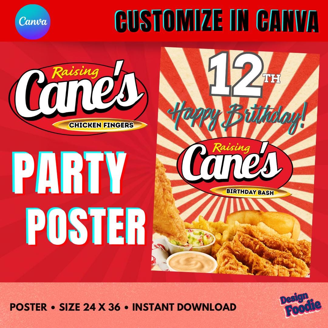 Personalize your own Raising Cane’s–style party poster instantly using this easy-to-edit Canva template. Perfect for birthday parties, family events, holiday setups, posters, banners, and social media.