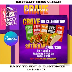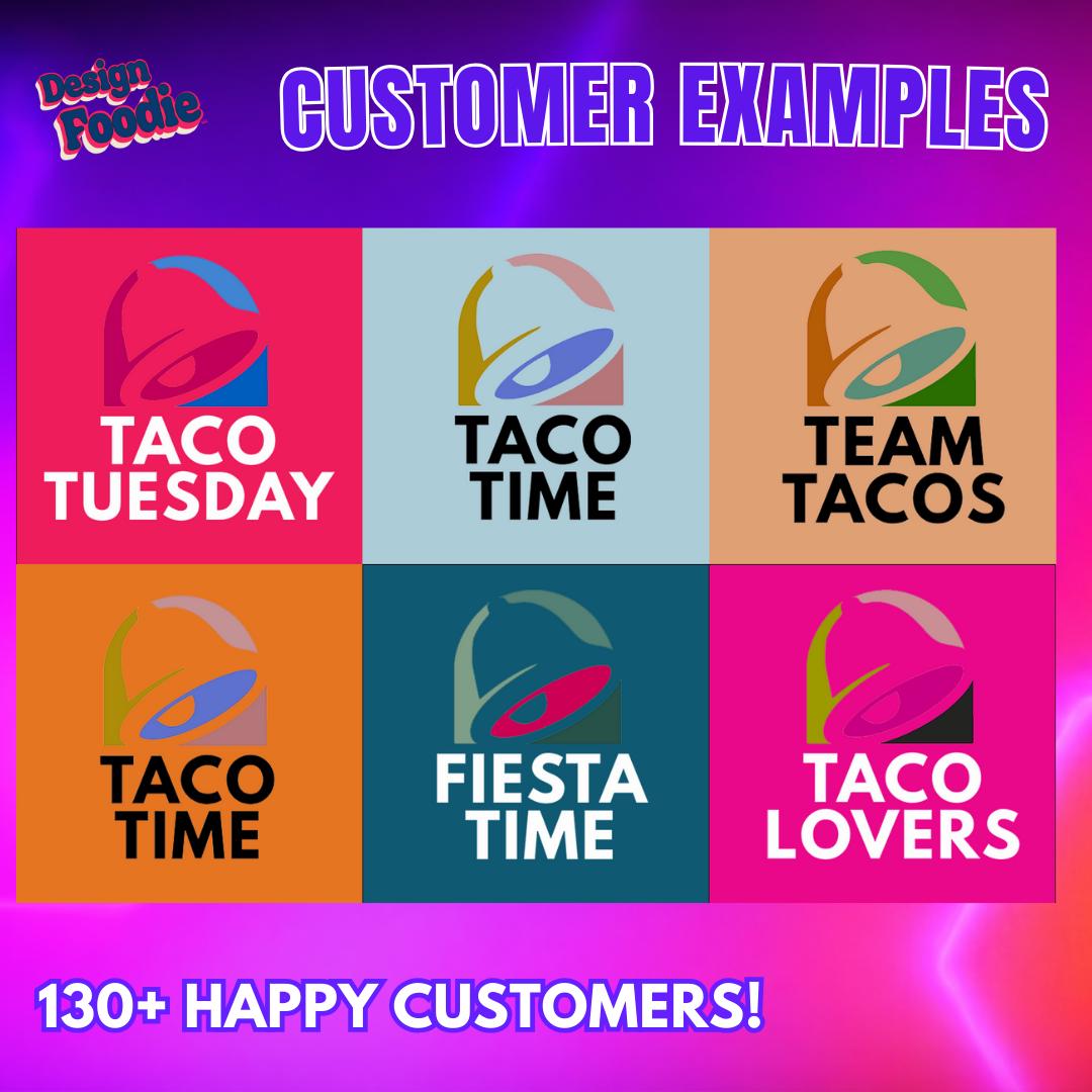 🎉 WHAT’S INCLUDED You’ll receive instant access to a Canva template that allows you to edit: Color Combinations Name text Tagline (“TACO TIME,” “TACO TUESDAY,” etc.) Move Layout elements