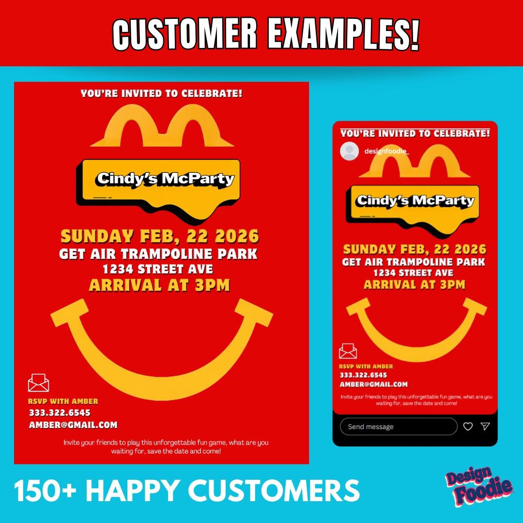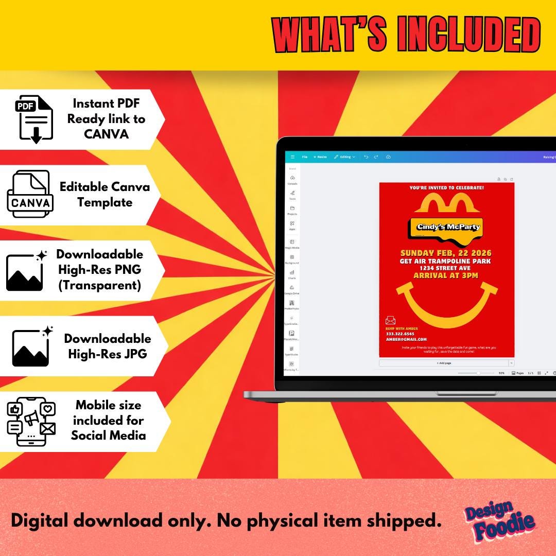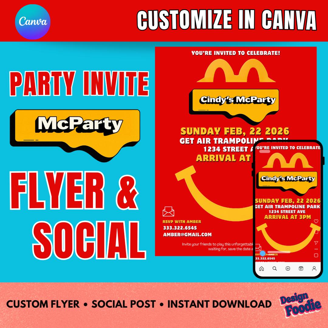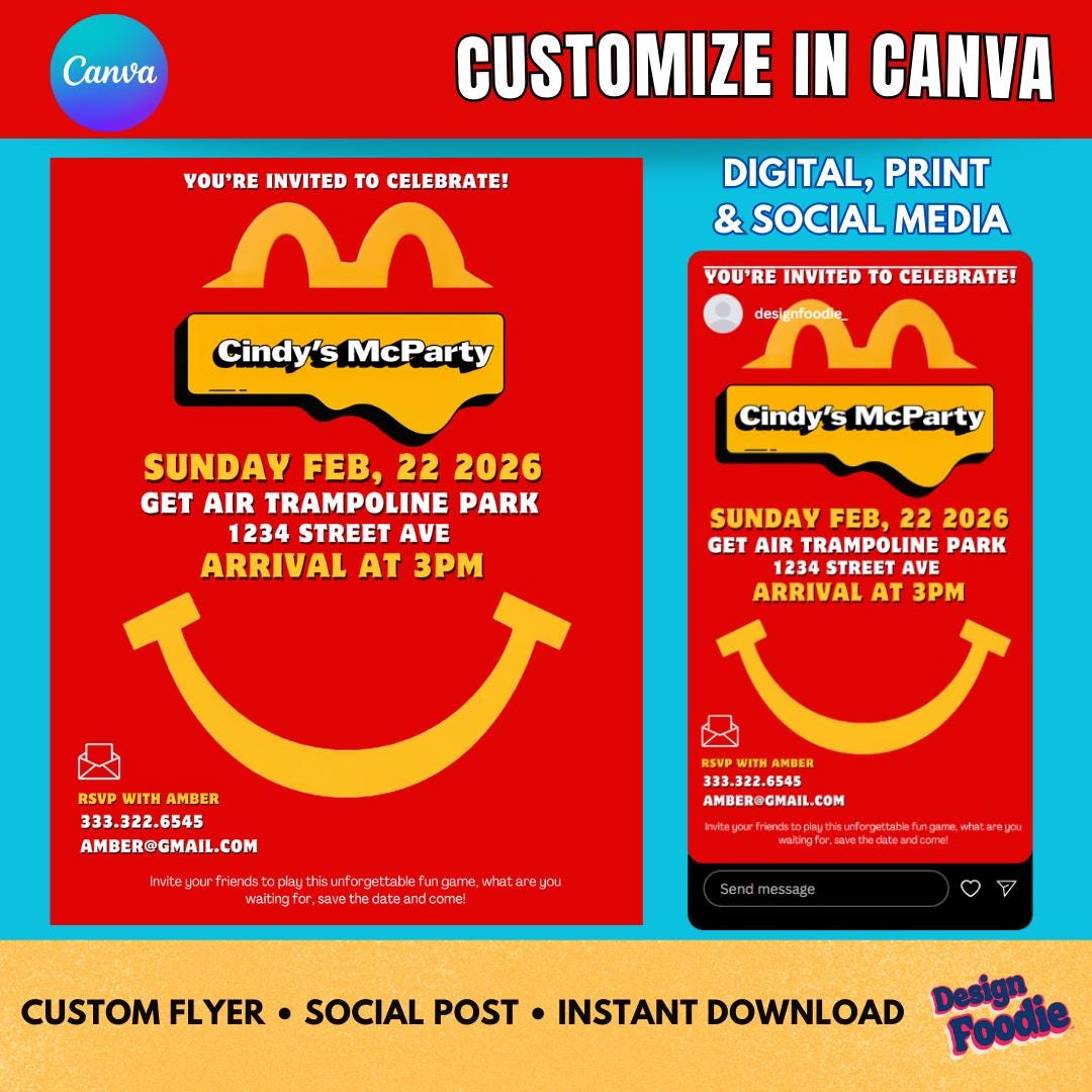 Throw the perfect fast-food-themed celebration with this Editable McDonald's Party Invitation! Edit in minutes using Canva — no software needed. Perfect for birthdays, teen parties, office events, graduations, or anyone who LOVES McDonald's.