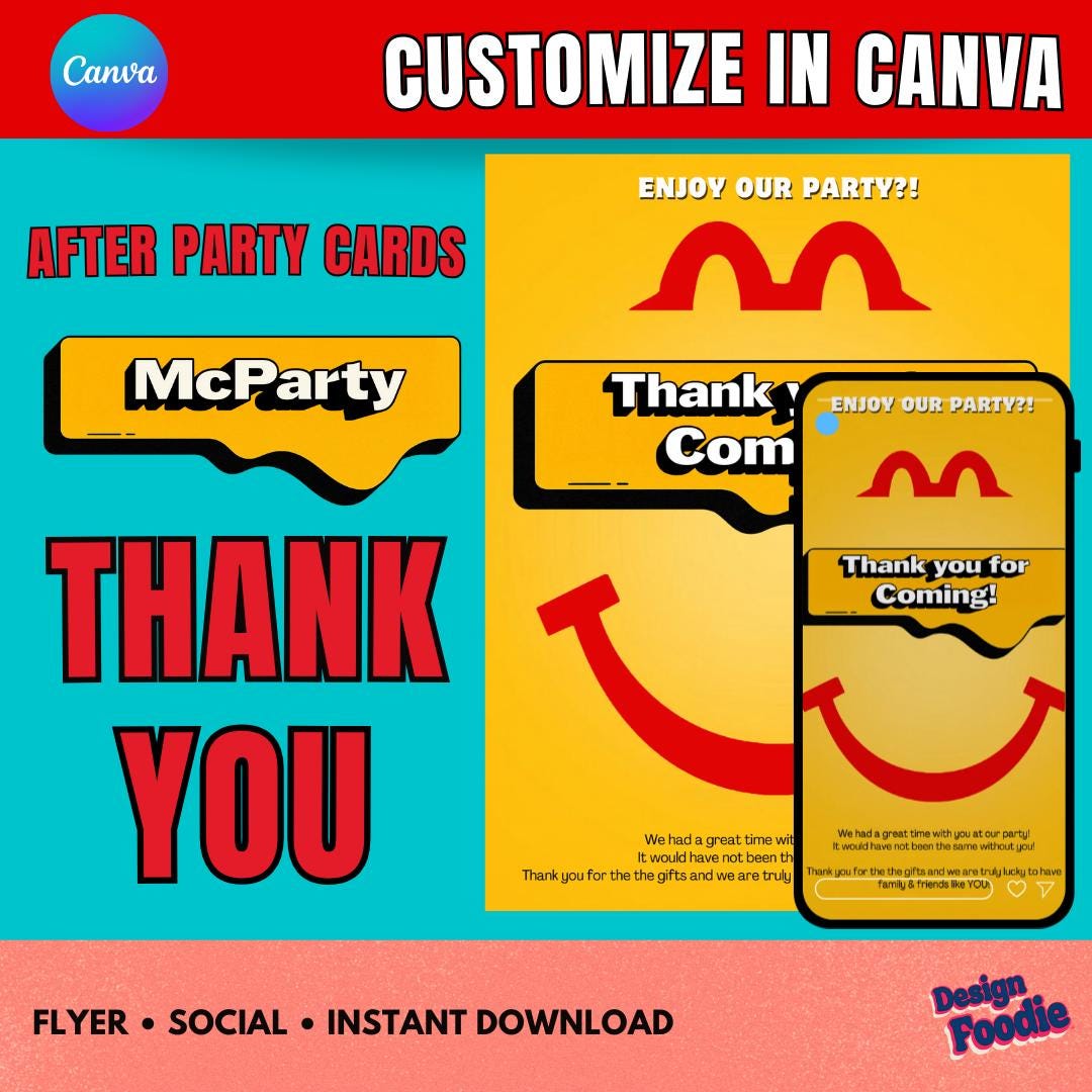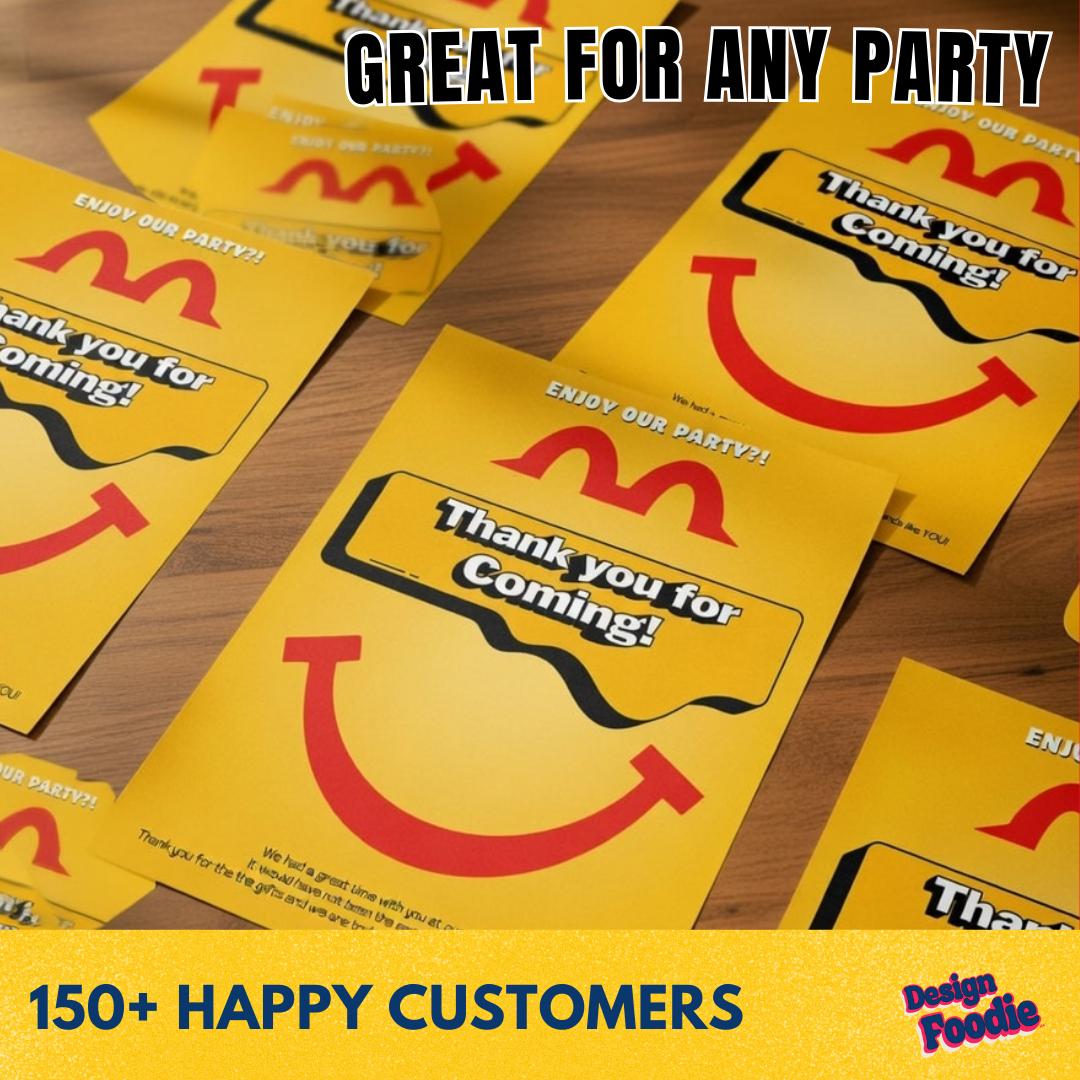 đ Say THANK YOU in fast-food style! đ Show appreciation to your guests with this McDonaldâs-style Thank You Card, designed to match your party perfectly and edited instantly in Canva.