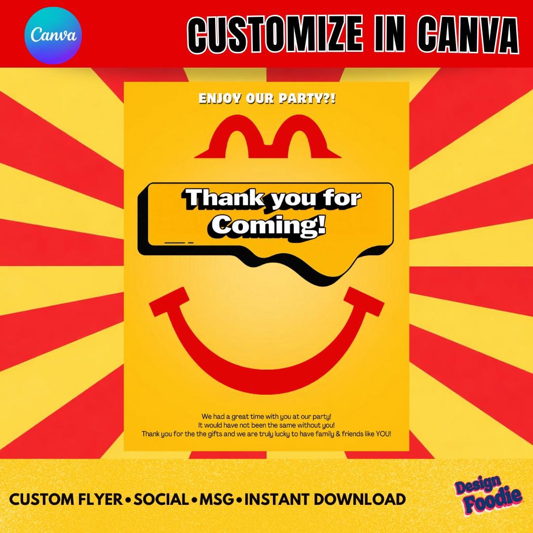 đ IMPORTANT NOTES ⢠Digital download only â no physical item will be shipped ⢠Editable only in Canva (free account works perfectly) ⢠Designs are parody-inspired and not affiliated with McDonaldâs or any restaurant brand