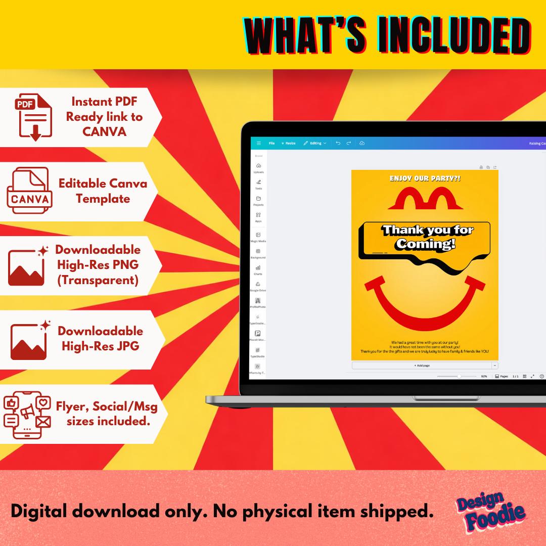 â WHY YOUâLL LOVE IT â Fun, bold McDonaldâs-style design â Matches banners, flyers & full party kits â Fully customizable â unlimited personal use â Print or share digitally â High-quality, professional layout â Designed by Design-Foodie â fast-food parties done right đĽ