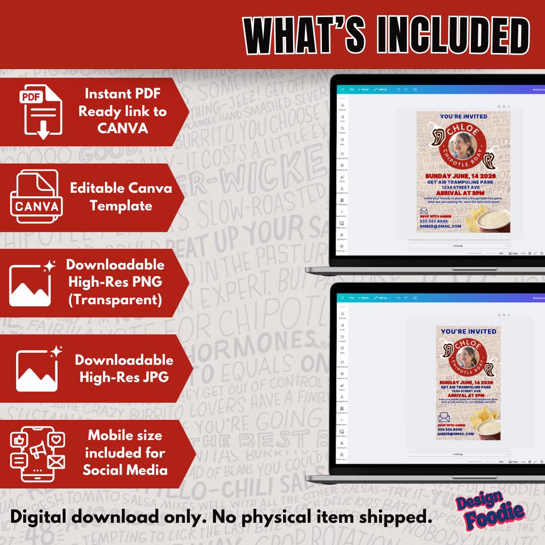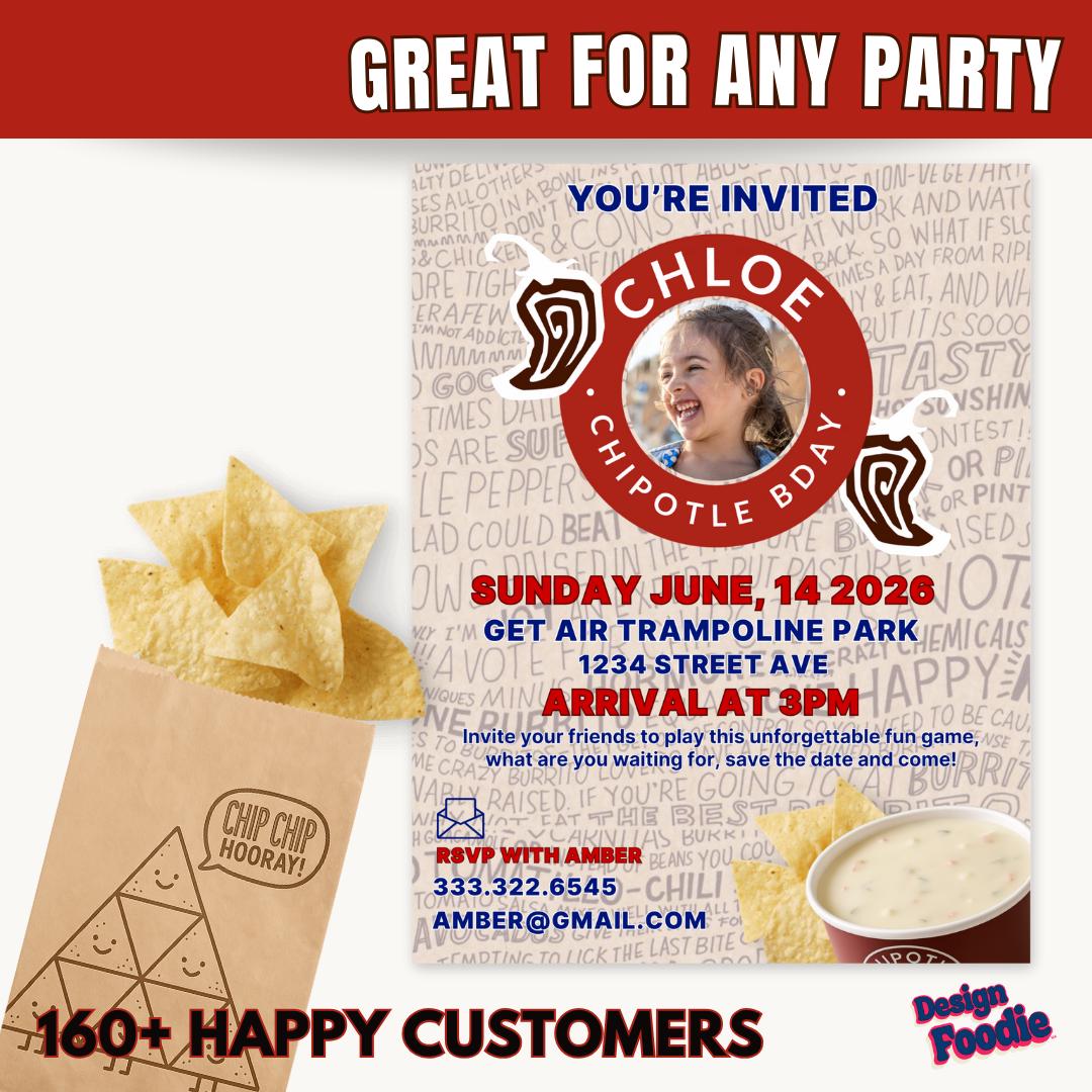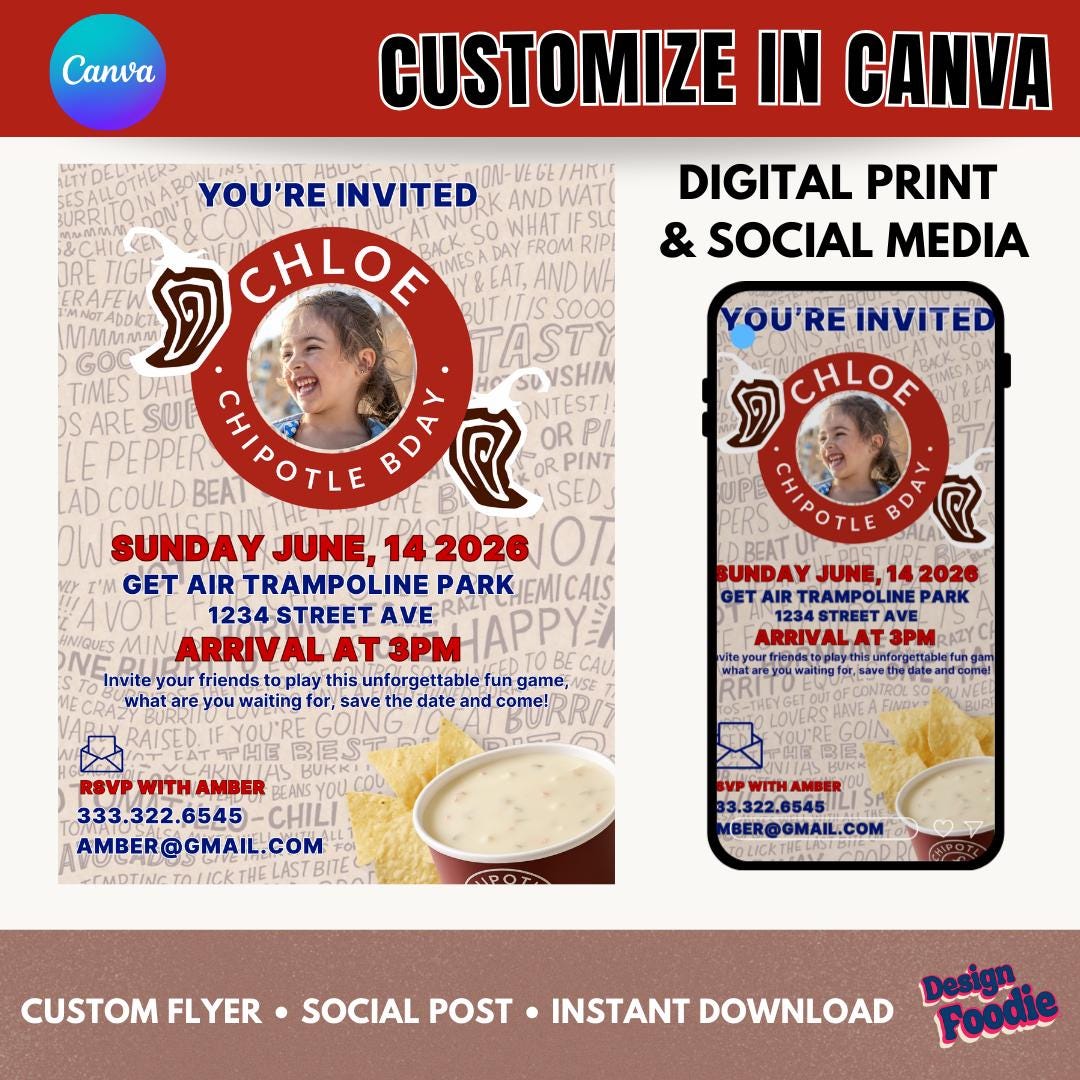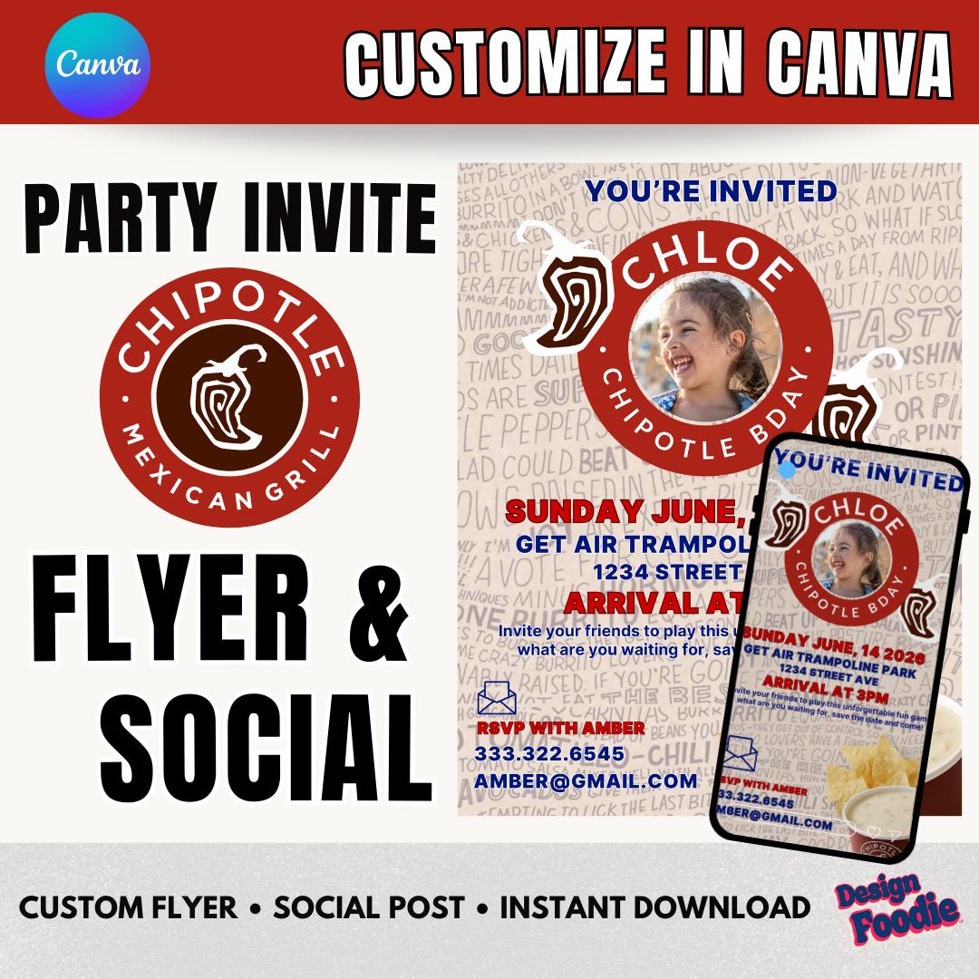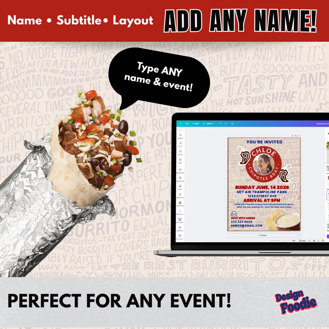 Throw the perfect fast-food-themed celebration with this Editable Chipotle Party Invitation! Edit in minutes using Canva — no software needed. Perfect for birthdays, teen parties, office events, graduations, or anyone who LOVES Raising Cane’s.