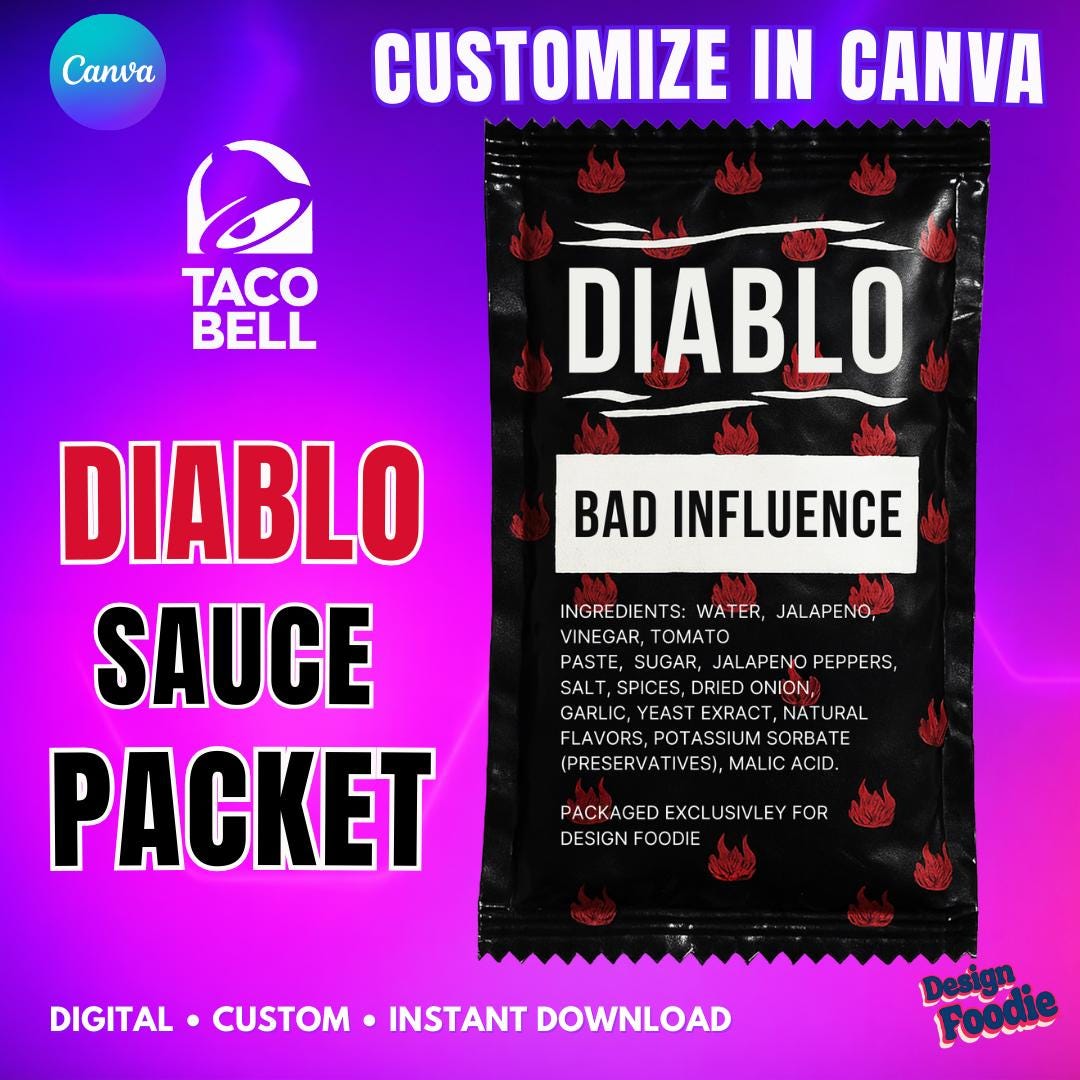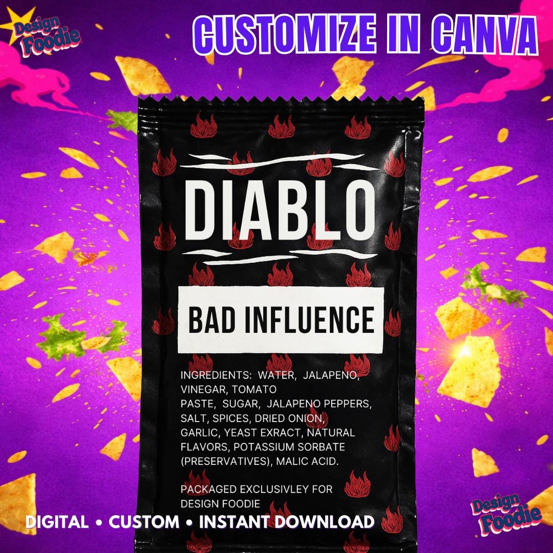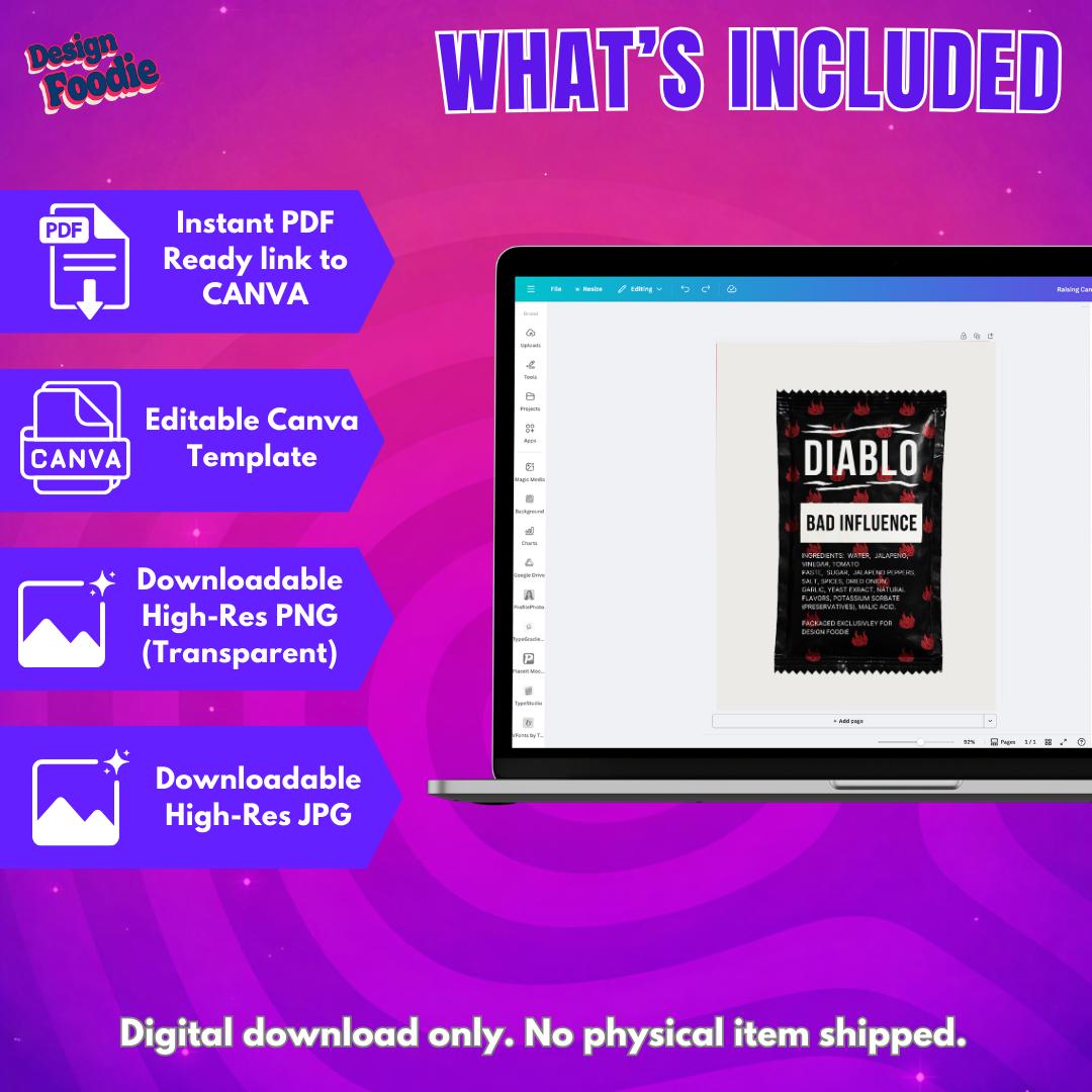 ✨ WHAT’S INCLUDED • 1 Fully Editable Canva Template • Pre-designed DIABLO sauce packet layout • Editable headline, sub-phrase & ingredient text • High-resolution export (300 DPI) • Approx. 5" x 7" size (scalable without quality loss)
