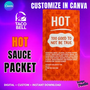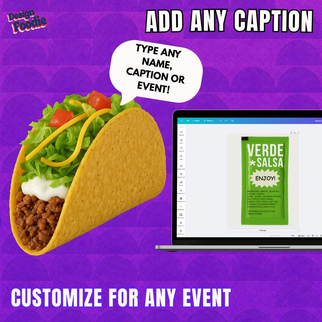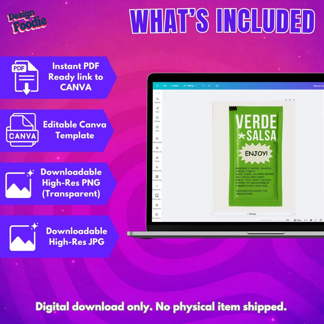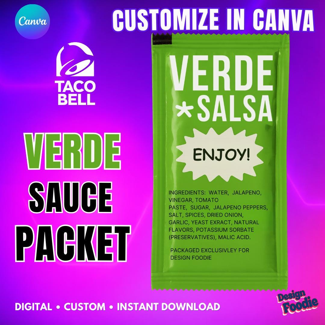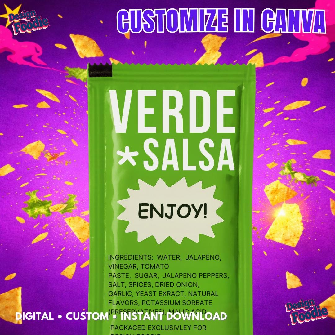✨ WHAT’S INCLUDED • 1 Fully Editable Canva Template • Pre-designed VERDE sauce packet layout • Editable headline, sub-phrase & ingredient text • High-resolution export (300 DPI) • Approx. 5" x 7" size (scalable without quality loss)