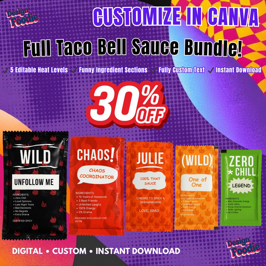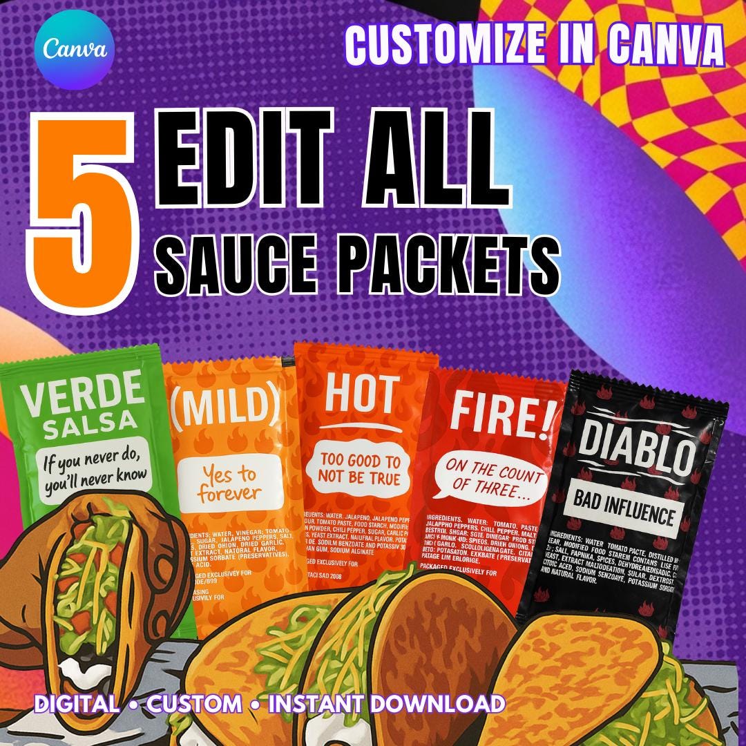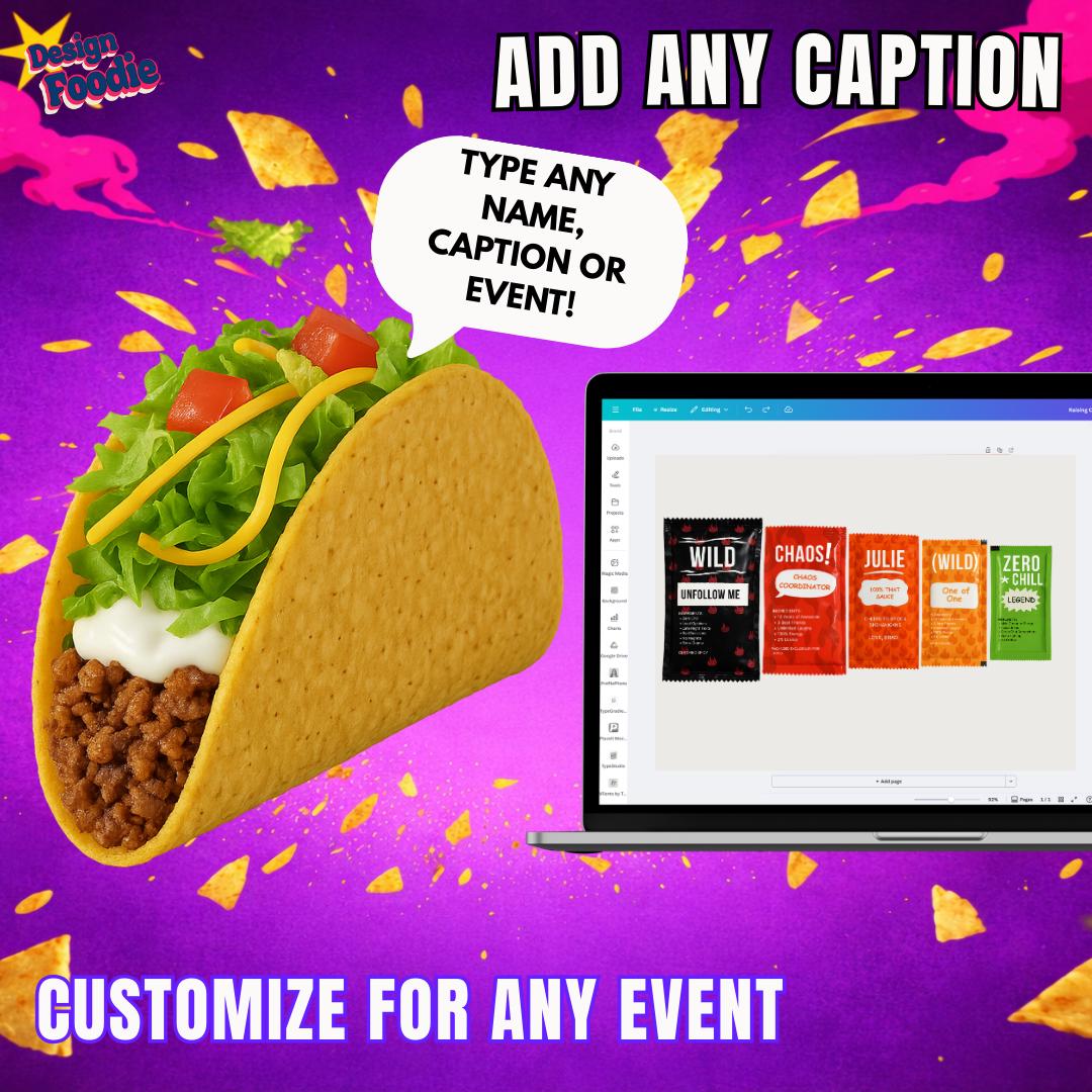 🔥 Don’t Pick One. Own The Entire Heat Lineup. Create your own bold, funny, fully customizable taco-style sauce packets — all 5 flavors included — editable instantly in Canva.