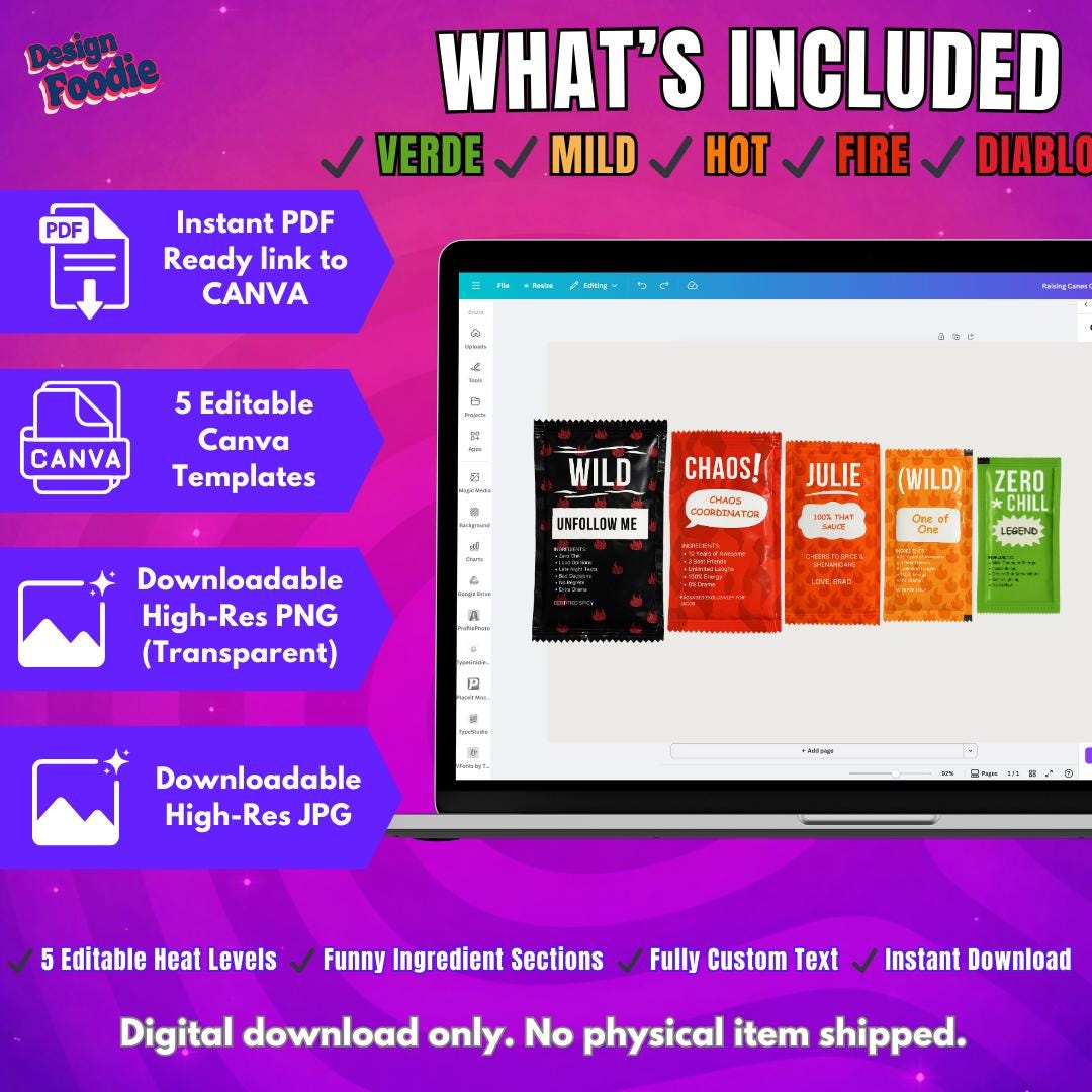 ✨ WHAT’S INCLUDED • 5 Fully Editable Canva Templates • Pre-designed sauce packet layouts • Editable headline, sub-phrase & ingredient text • High-resolution export (300 DPI) • Approx. 5" x 7" size (scalable without quality loss)