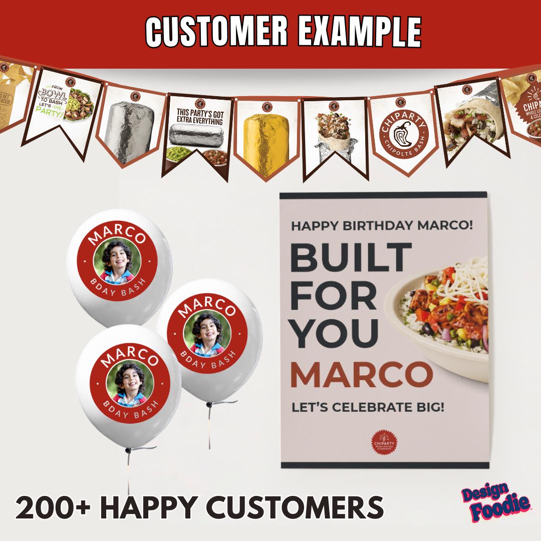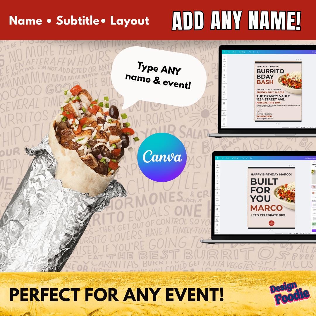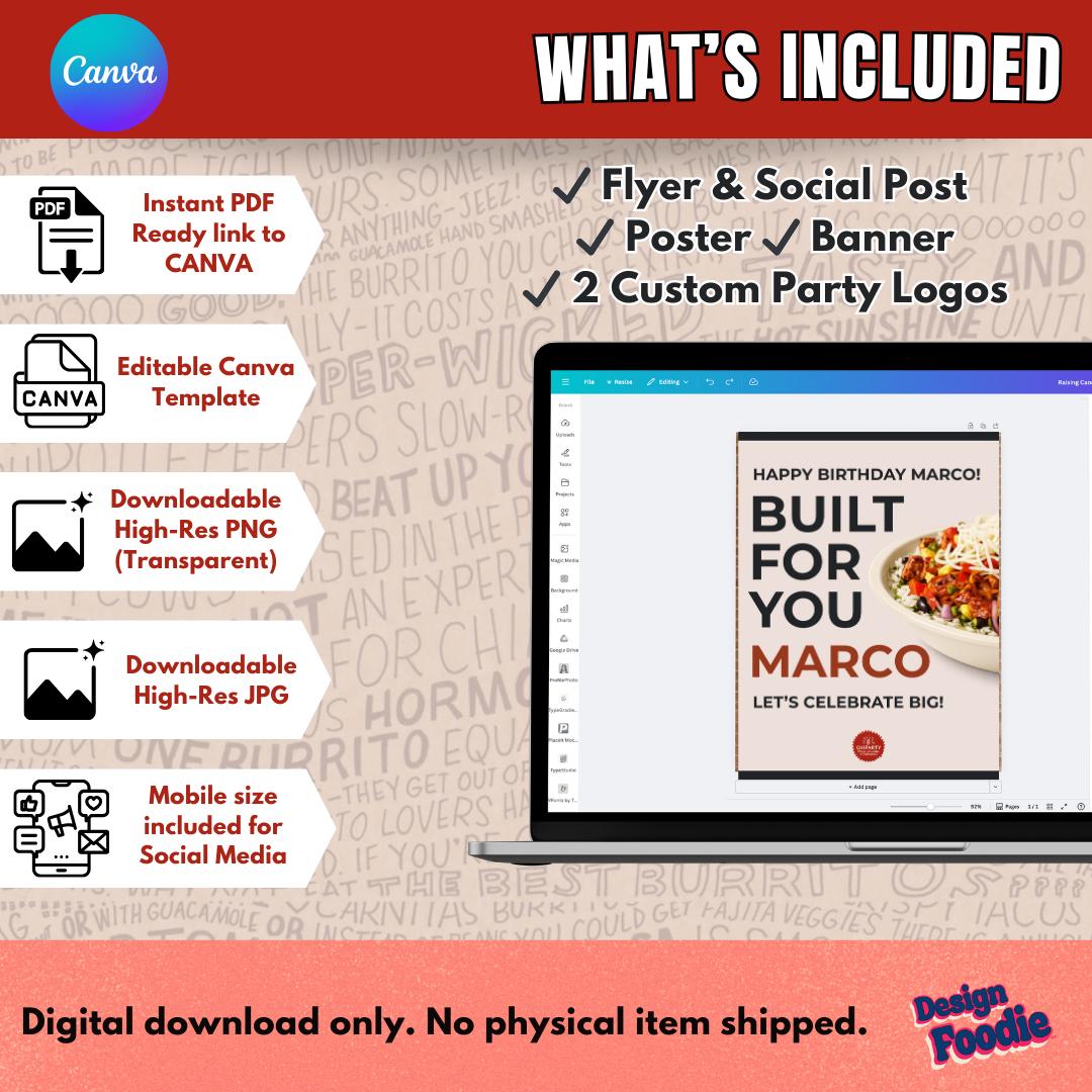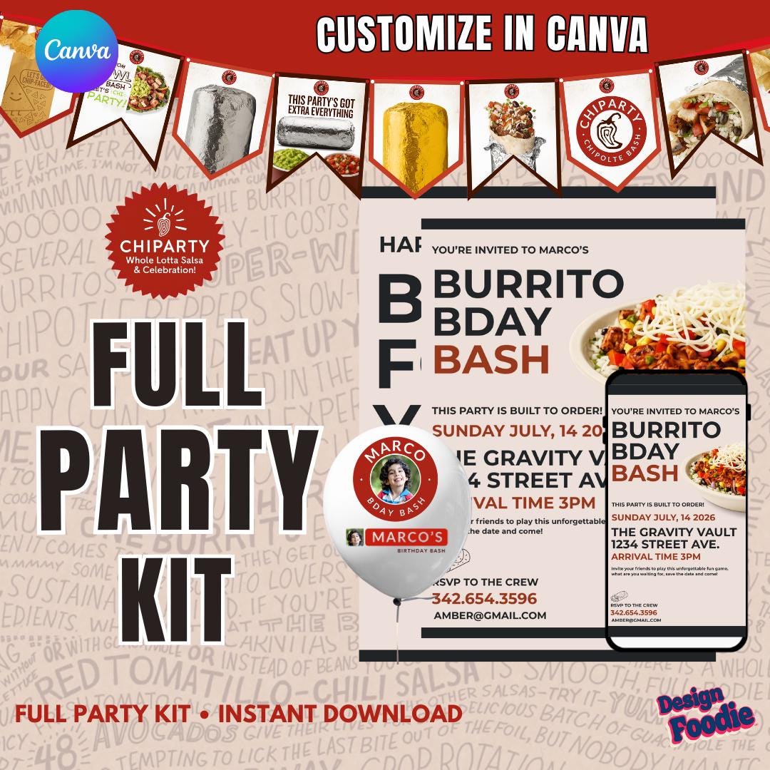 🔥 Throw a Chipotle-style party that’s bold, fun, and customized by YOU! 🔥 Create your own fast-food–inspired party decor instantly with this editable Canva Party Kit — now including a custom logo for party supplies. Add names, event titles, schools, or fun phrases — the possibilities are endless!