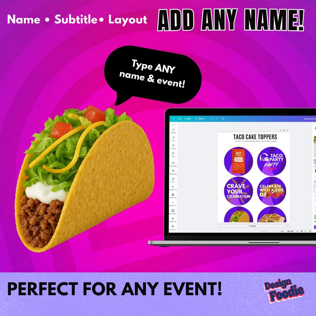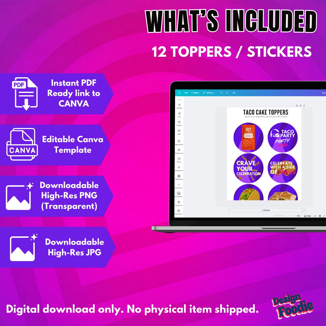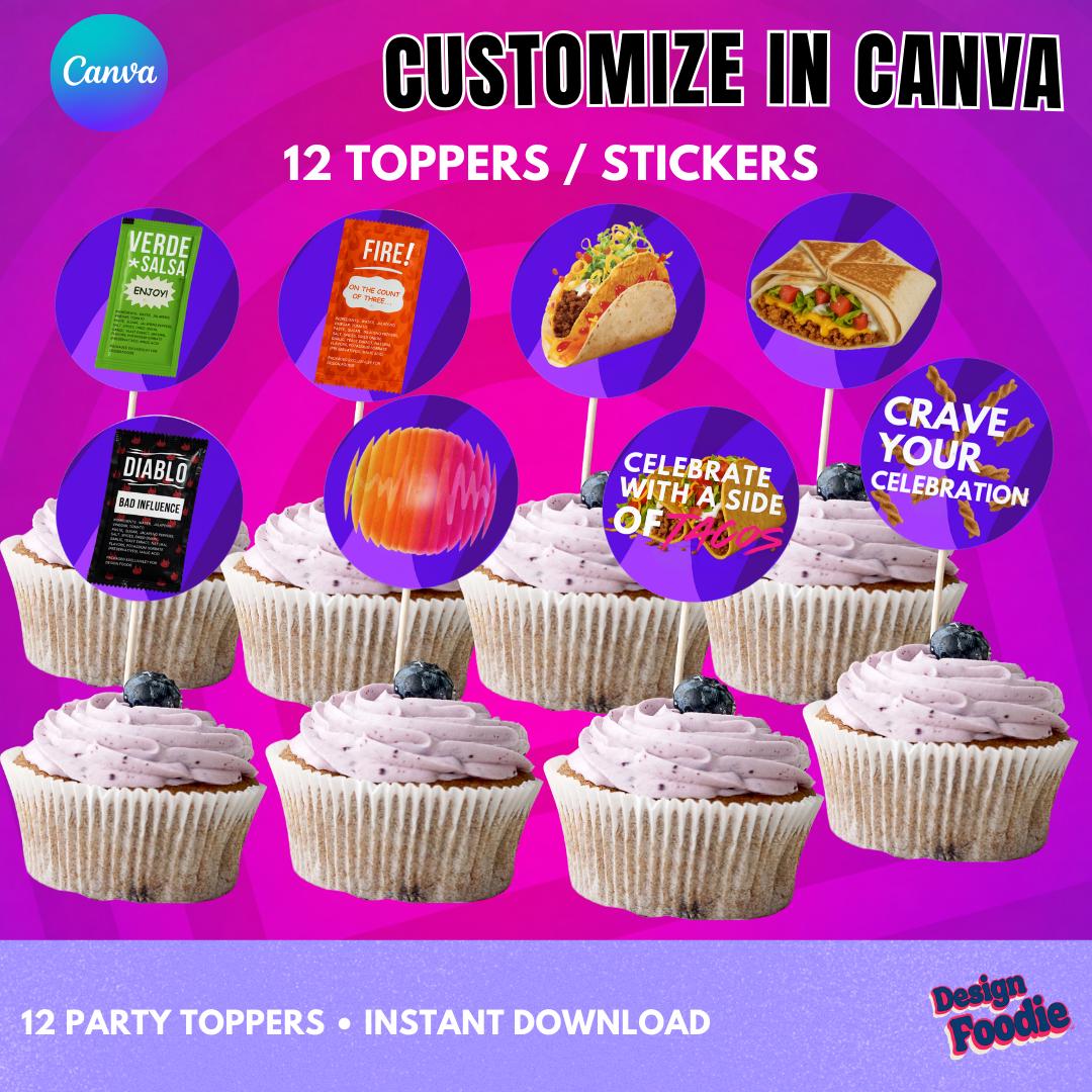 Taco Bell Party Toppers Editable in Canva – 12 Cupcake Toppers & Stickers