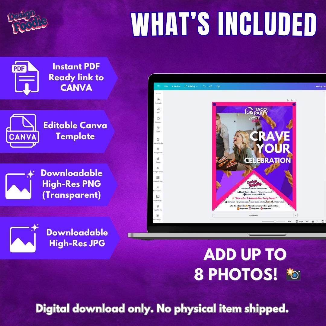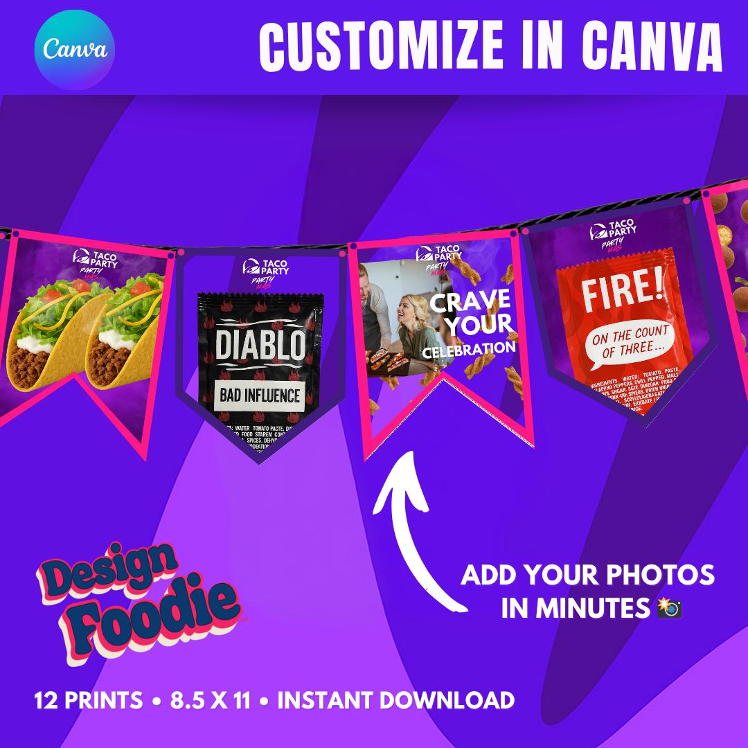 💡 WANT THE FULL PARTY LOOK? Complete your celebration with the matching Taco Party Kit, including: ✔ Full Banner Set ✔ Invitation Template ✔ Poster Design ✔ Social Media Templates ✔ Custom Fast Food–Style Logo ✔ Sauce Packet Designs 🎉 Bundle everything & save $10+ 👉 Available now in our shop!