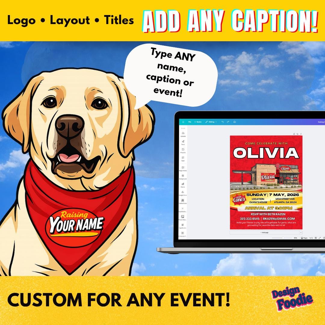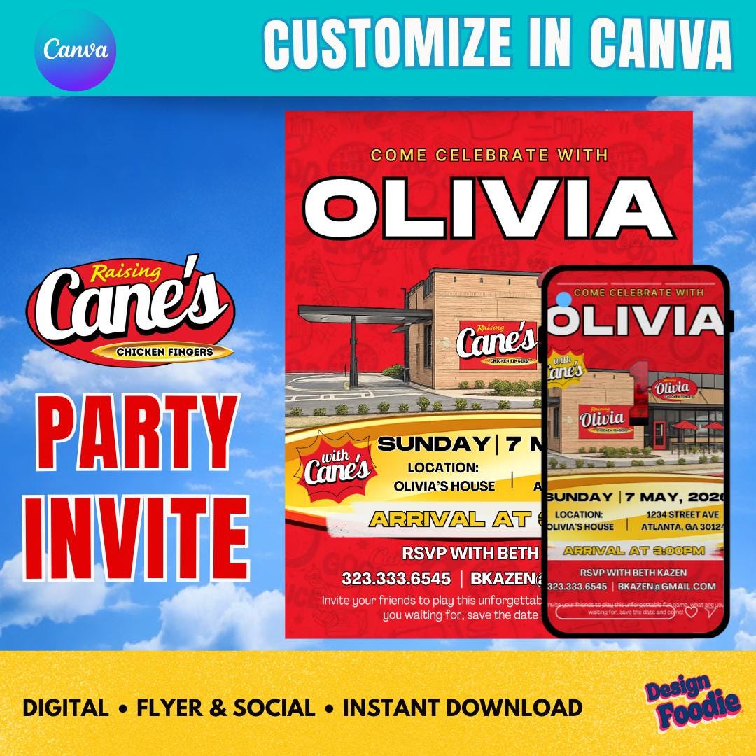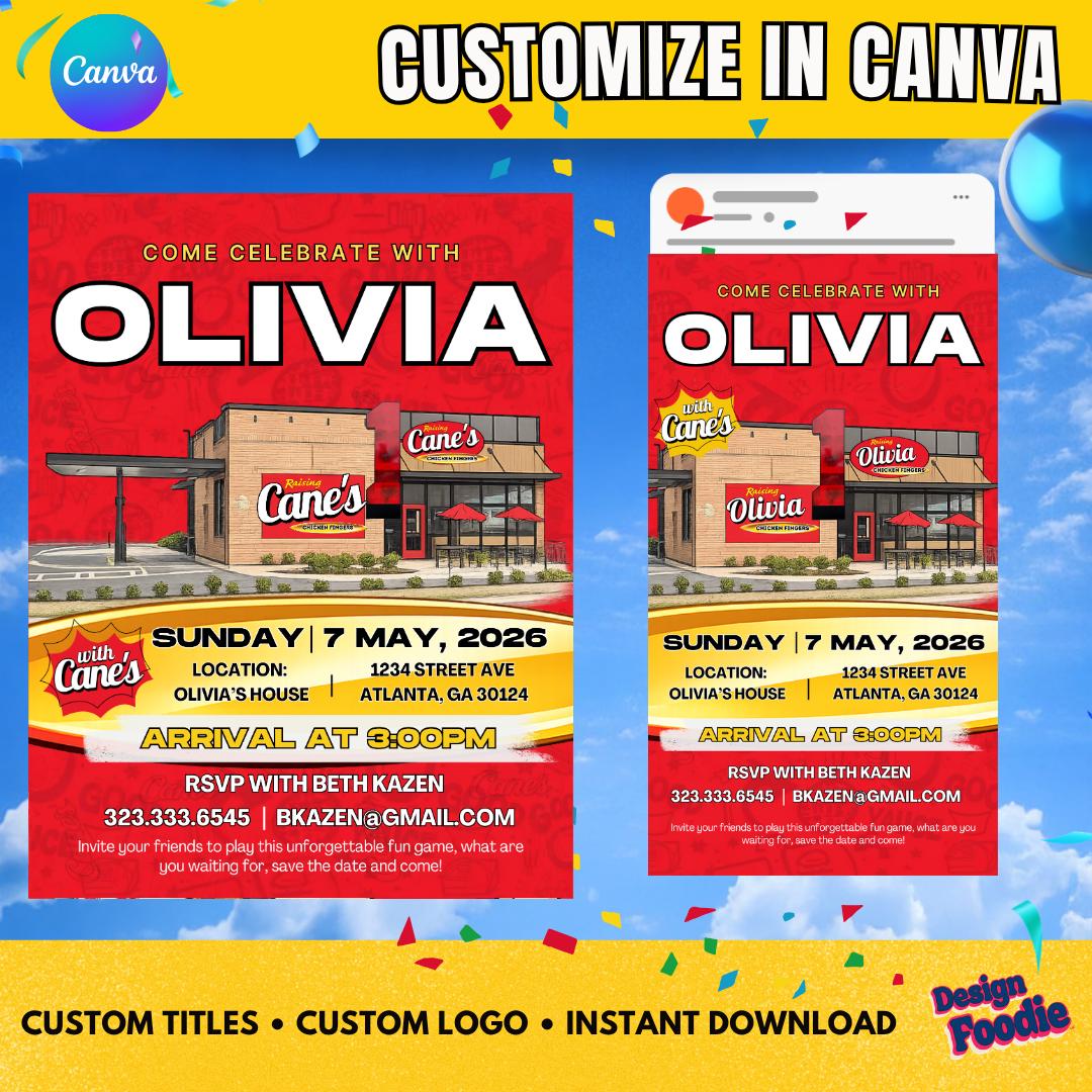 🔥 Throw a Raising Cane’s–style party that’s finger-lickin’ FUN — and fully customized by YOU! 🔥 This editable Canva invitation brings bold fast-food energy to your celebration. Instantly personalize the name, date, location, and party details — no waiting, no designer needed.