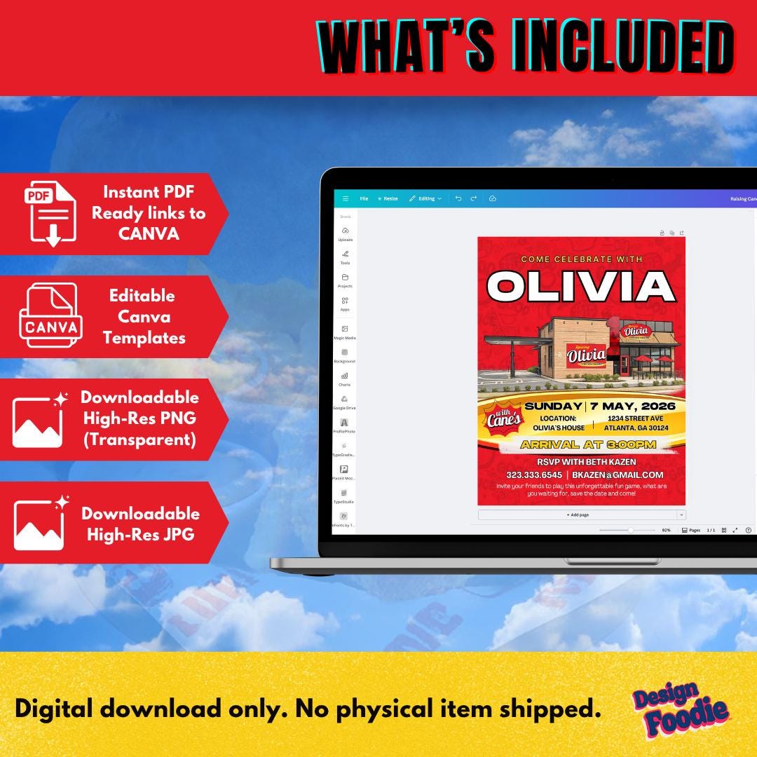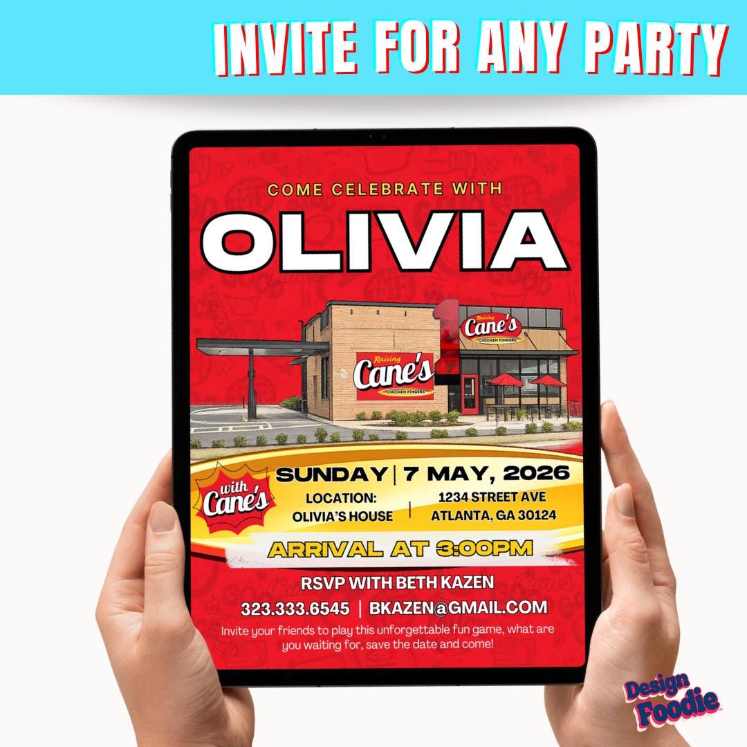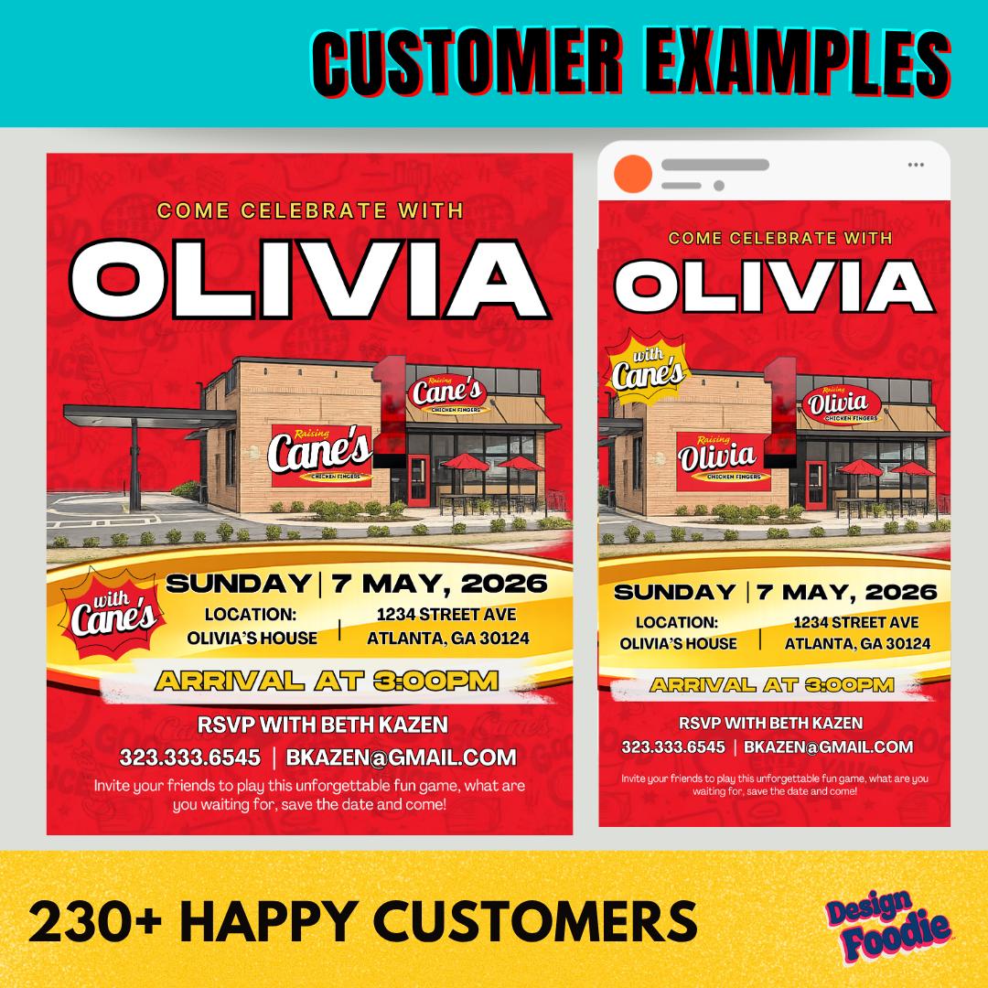 🔥 Throw a Raising Cane’s–style party that’s finger-lickin’ FUN — and fully customized by YOU! 🔥 This editable Canva invitation brings bold fast-food energy to your celebration. Instantly personalize the name, date, location, and party details — no waiting, no designer needed.