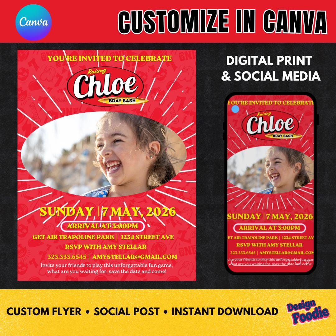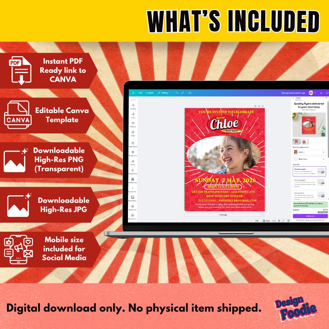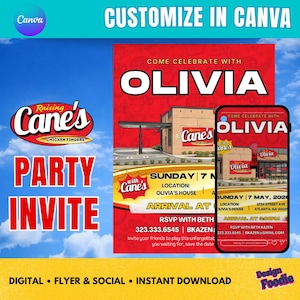Edit in minutes using Canva — no software needed. Perfect for birthdays, teen parties, office events, graduations, or anyone who LOVES Raising Cane’s.